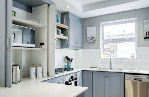 The semi open-plan kitchen has all mod-cons as well as a breakfast bar.