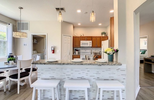 Cook up a storm in a renovated light-filled kitchen, relax in one of the generously sized bedrooms, plunge into your private pool , see the sights of nearby theme parks, or experience relaxation right on the golf course.ste elegante alojamiento es ideal para viajes en grupo.