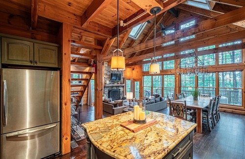 The open floor plan allows guests to enjoy the lake and forest views from the kitchen, dining room and living room. Ample light streams in from the skylights and the wall of windows facing the lake.