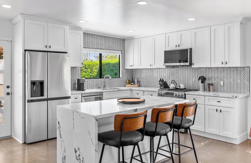 Inside, Sunny Dreams blends timeless mid-century architecture with modern comforts. Floor-to-ceiling windows bring the outdoors in, with pool views from the living and dining spaces. Two living rooms ensure there’s plenty of space to relax, one anchored by a striking brick fireplace and the other designed for media and lounging with a large smart TV. The chef’s kitchen features a gas range, modern appliances, a spacious island with a breakfast bar for three. Contemporary artwork and designer furnishings create a vibrant yet comfortable atmosphere, making it easy to gather, entertain, or simply recharge.