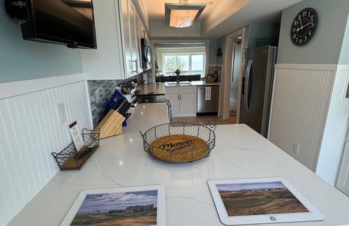- Kitchen is equiped with plenty of cabinet space, TV, K-Cup, drip coffee and espresso station, and wine fridge.