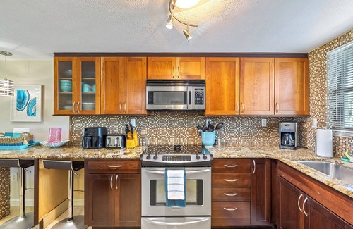 The bright and airy living room features comfy, modern furnishings including a recliner and a smart TV, making it the perfect place to unwind after a day in the sun, plus, the convertible sofa bed offers extra space for guests.The updated kitchen, complete with granite countertops and stainless steel appliances, has all the tools you need, including a standard and Keurig coffee maker, espresso machine, and blender. Enjoy ample dining space with seating for up to 9 guests, ideal for everything from family dinners to game night gatherings.