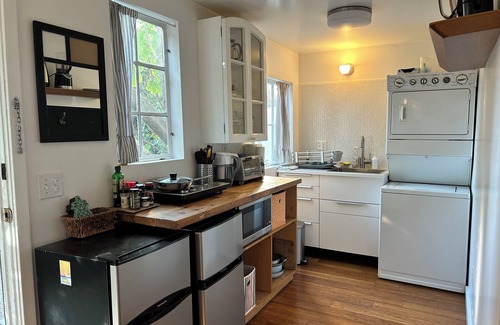 Our Garden Studio has been a favorite spot many guests over the years. A perfect retreat in the heart of Silver Lake's lively Sunset Junction neighborhood. The apartment is a comfortable, well-laid out and cozy space that opens onto a lovely gravel yard with love seat and table set under a great shade tree. The apartment is 2 flights below street level and offers privacy and calm in the midst of this thriving neighborhood. We're two blocks' walk from the Tuesday and Saturday Farmer's Market at Polka Dot Plaza. Sunset Junction, where Sunset and Santa Monica Boulevards cross, is 3 blocks away and offers multiple great coffee and restaurant options. The Studio works well for one person or a couple. Full bath, Full-size bed, small dining/working table overlooking the yard, solid wifi, kitchenette, washer and dryer in the unit.