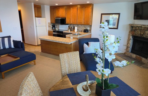 The master bedroom features a plush pillow-top king bed, flat-screen TV, and an en suite bath with a relaxing jacuzzi tub/shower. The second bedroom offers a comfortable queen bed with a half bath just off the hall. The open-concept living, dining, and kitchen area is surrounded by wrap-around windows showcasing breathtaking lake views, and a cozy fireplace adds warmth for cooler evenings. The fully equipped kitchen makes meal prep a breeze. Suite #2 is a favorite with returning guests—reserve early to secure your stay! Complimentary wireless internet is included.