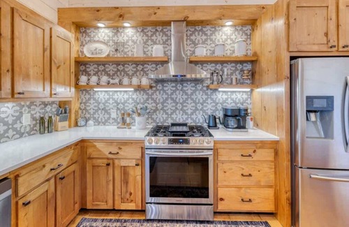 The spacious living room features soaring ceilings, a cozy fireplace, and a massive wall of windows that look out over the trees. The fully equipped kitchen comes with modern appliances and everything you need to whip up delicious meals during your stay.