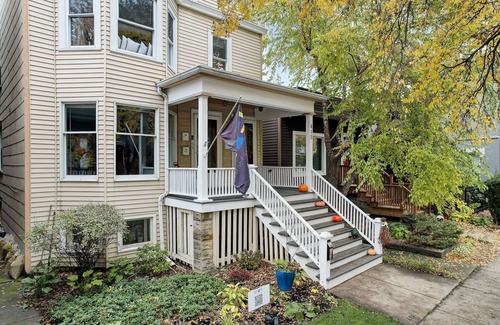 This cozy 2nd floor retreat is the perfect place to relax after a day exploring Chicago and historic Oak Park. Our decor features works by artist-in-residence Satish Prabhu, whose gallery and workspace is below. Sleep comfortably in buttery-soft linens, cook in our well-appointed kitchen, read and work in the sunroom or the dedicated workspace in our west bedroom. You will want to discover shops, cafes/restaurants, and scenery on foot, but parking for one included if needed.