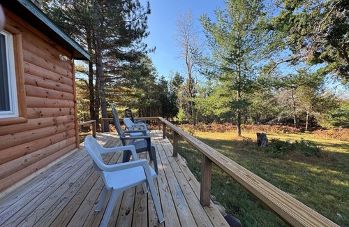 Unplug and unwind at this charming cabin nestled in 80 acres of peaceful woodland Northeast of Curran, Michigan. Perfect solitude for nature lovers, this rustic retreat offers a serene escape from modern distractions—there is Wi-Fi internet, but in keeping with the intended quietude, there is no big screen TV. You can enjoy the warmth of a wood-burning fireplace, the ambiance of a fire pit under the stars, walking the trails through the forest, or lounging outside on the front deck.