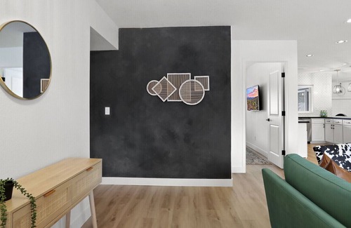 Our professionally designed interior remodel was completed in December 2022. All furnishings were hand selected by our designer. There are 5 unique and modern bedrooms with a total of 6 beds – 2 kings, 2 queens, & 2 doubles. Each bed is made with clean and cozy linens, and our guests often tell us how comfortable our beds are. The kitchen is fully equipped and has everything you may need to cook and enjoy large meals for friends and family. The living room has a record player with an impressive collection of records that includes many iconic artists and albums. The dining room has an 8-person dining table and a cozy indoor wood-burning fireplace.
