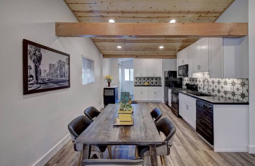 A sparkling modernist gem with contemporary finishes and an open-concept kitchen and living area, perfect for small gatherings.