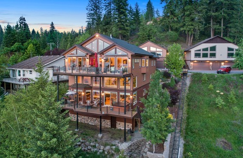 A place to leave all your worries behind and enjoy the ultimate luxury family vacation. Simply take in the spectacular lake views from just about any spot in the house and relax with a book and your favorite beverage. Gather with your family and friends to eat on the large patio decks or at the massive dining room table. Sneak away for a little quiet time in the wine tasting room and enjoy a game of chess. If you ate too much, work it off in the gym or sweat it out in the sauna. Take a ride on your own personal tram down to the dock where you can park your boat/jet skis. Take a swim or fish off the dock, or grab one of our kayaks and/or paddle boards and cruise off the dock. Relax in the spa on the lower deck and take in the lake view, beautiful sunsets, and vista of the Rathdrum mountains. Relax in front of the downstairs deck fire pit. Cozy up together under a heater and the beautiful night sky. Keep the kids entertained in the well equipped massive game room.