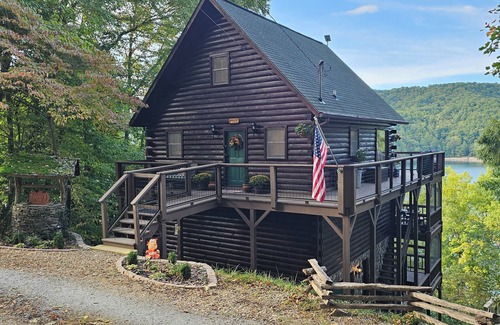 The Hemlock Haven is a beautifully decorated log cabin on Lake Nantahala with stunning lake and mountain views. It features two bedrooms, two and a half baths, a loft, and a bonus room. Enjoy multiple private porches and decks on all levels, an open floor plan, large windows, and hardwood floors. Accommodations include a king bed, queen bed, three twins, and a loft. The master has a private screened porch. Access the private boat dock across the street. Stairs required for cabin and dock access.