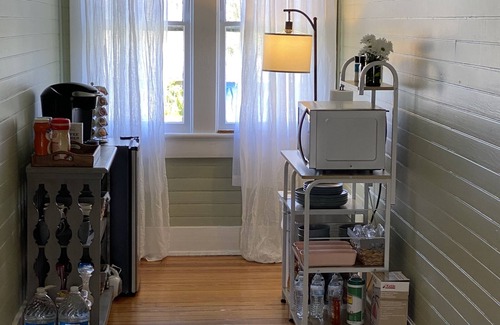 - No full kitchen: Updated hotel set up (mini fridge, microwave, plates, silverware, assorted snacks, coffee & water ( All food and beverage provided complimentary)