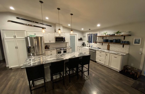 NEW!! MORE PHOTOS COMING! WILL BE READY MID-FEBRUARY! 16 person single story ranch home with spacious outdoor area. The home includes 6 Bedrooms (4 kings, 3 queens & bunk bed) with 3 full baths, spacious open concept living/dining/kitchen area, game room and trex deck patio w/ large Hot Tub. PETS WELCOME! Tons of games and room for family or friend gatherings. Chickens for fresh eggs, and kid play structure. Deer live in the neighborhood and can be seen in both the front and backyard daily. Fishing nearby. 25 MIN to MT Bachelor, 8 Min to downtown Bend, 10 MIN to Sunriver. 4 miles to Walmart.