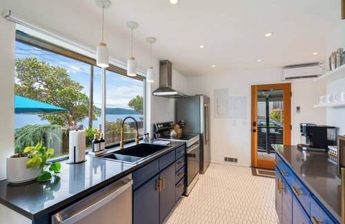This light-filled Hood Canal beach house combines upscale design with cozy comfort. Two bedrooms feature new king beds with luxury linens, plus a queen sleeper sofa for additional guests. Large windows frame breathtaking water views and fill the home with warmth.