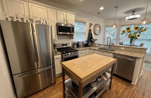 3 Bedroom oasis downtown Atlanta less than 1 mile from The Mercedes-Benz Stadium and walking distance to Publix supermarket, Georgia State stadium, trendy cafes, restaurants, and local shops! Primary bedroom boasts a king sized bed with french doors opening to a second story patio. 2nd bedroom Queen, 3rd bedroom 2 twin bunkbeds. Living room has full sectional and 70 inch television with Bose surround sound system cable and Apple TV. 10 minutes from the Atlanta airport and all major highways.