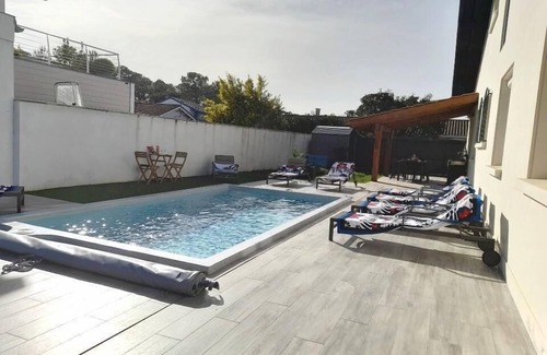 An uninterrupted beach of 106 km stretching along the coast, welcome to Ondres en Landes south coast, seaside resort on the Atlantic coast with its 2 km of beach 15 minutes from Bayonne. When summer comes, this beach turns into a huge playground, walks, sandcastles, swimming, surfing, paddle boarding, beach sports, volleyball, or just to laze around! The refuge of the marine pins, an independent house enjoys a privileged location close to all amenities, shops and services, while being in a quiet area. Here the private heated swimming pool is a plus for your holidays (6mx3.5 m depth 1.50m, secured by a tarpaulin) open from the beginning of May to the end of October. You will enjoy the terrace around the swimming pool and the pool-house area with garden furniture and deckchairs. An enclosed land area of approximately 200 m² with courtyard and small garden are offered, entrance gate with beep. Let yourself be seduced by the quality of the services offered, large beds, number of bathrooms, neat decoration and warm atmosphere of this holiday home, with family or friends, for your business trips, all year round. The ground floor space houses the living area with lounge (TV, Wifi), living room for meals and open fitted kitchen (dishwasher, electric oven, microwave, combined fridge freezer, 4 induction hobs), 1 bedroom with 180x200 bed that can offer 2 beds in 90x200 cm with its private bathroom with wc, 2nd bedroom with 160x200 bed with its private shower room with wc. Separate wc. The first floor serves 2 bedrooms (each bed in 160), 2 shower rooms each with a wc. The house has a garage used as a storeroom, housing washing machine and dryer. Parking possible in or in front of the property. For your comfort, bed linen, towels, household linen and baby equipment included. Boules pitch 20 m from the cottage. No parties allowed