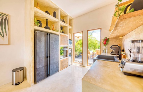 The Seminyak Penthouse offers two spacious bedrooms, featuring a bright, airy design with high vaulted ceilings and chic custom interiors. Take in the beauty of the tropics from the comforts of the fully enclosed, climate-controlled living with floor-to-ceiling windows so you can still enjoy the Bali sunshine. Whether hosting a dinner or enjoying cocktails with friends, the kitchen is well-equipped for any event - it even features an ice cube maker! The property’s immersive tranquil spaces provide the perfect opportunity to unwind and enjoy everything a tropical vacation has to offer.