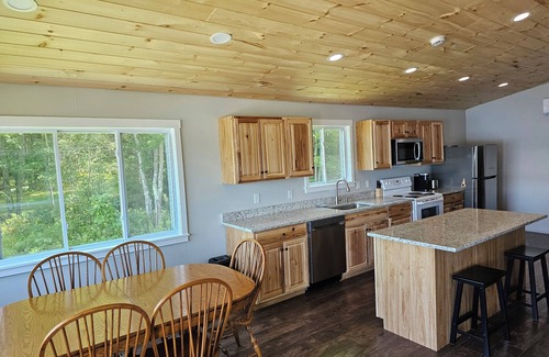 The cottage is located at picturesque Loon Pond, in Gilmanton NH. It offers two bedrooms and one bathroom. The kitchen is open concept with cathedral ceilings, and boasts a large granite island along with all of the amenities of home. The main bedroom has a queen sized bed, 42" TV, and a door directly to the bathroom. The second bedroom is a rustic camp style bunk room, which has twin sized bunk beds, a regular full sized bed, and a 32" TV with gaming system. There is a futon in the main room which converts into a full sized bed, and a large dining room table with 6 chairs that overlooks the beach and waterfront. Parking is to the right of the cottage, and there is ample space for vehicles. The beach is a private beach which is directly across the street from the cottage. It's fenced in to provide safety for both pets and people. The sandy beach slopes gradually into the water for the first 50 feet, making it great for children. There is a private dock, fire pit, swim raft, picnic table with umbrella, and three kayaks for guests to enjoy. The water depth at the swim raft is almost 30 feet! The public boat launch is also within walking distance of the cottage.