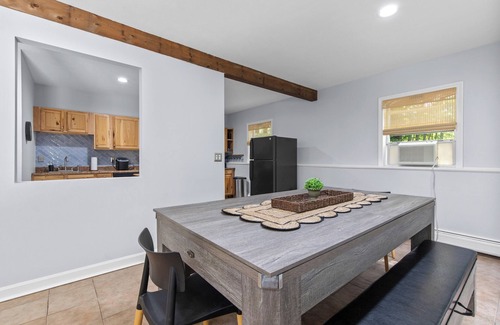 Inside, the home offers plenty of space to gather and unwind. The first floor is warm and welcoming, with a roomy dining area where the table easily transforms into a ping pong or pool table for evenings of laughter and friendly competition. A fully stocked kitchen makes it easy to prepare meals at home, while the cozy family room invites you to kick back after a day in the sun. A washer and dryer are also on hand to keep beach towels fresh for the next adventure.
