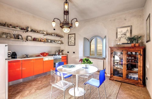 The Tower's terrace perched at the top of five high floors - with elevator of course - is perfect for summer dining with a bird's eye view, cocktails or sunbathing when you chose a change from the pool. The terrace crowns a collection of beautifully renovated and decorated suites and apartments, making a total of 6 bedrooms and 7 bathrooms, sleeping up to 12 people. Each room boasts historic and characteristic features, such as terracotta floorings, beamed ceilings, stone fireplaces, and ancient doors that has been combined so cleverly with a modern artistic furnishings that combines family antiques with modern and contemporary design pieces. The Torre offers an unforgettable and unique experience of living in a real medieval fortified castle in exclusivity.The castle interior with its high ceilings and soothing proportions, and artful while cheerful furnishings, provides guests with large and gracious areas to share both family, social and personal moments. Though rented as a an exclusive use property each floor offers a private hall with seating area, and bedrooms and bathrooms. In addition to the ground floor kitchen, there are two independent kitchens at the third and the fourth floor which can be used for breakfast, lunch and dinner. You can also enjoy your outdoor meals, on the magnificent 360° panoramic terrace (25 sq.mt.), or in the shade of the ancient trees of the park. The swimming pool, located in a sunlit and peaceful area between olive trees and rosemary, offers moments of pure pleasure in a truly Italian ambiance.