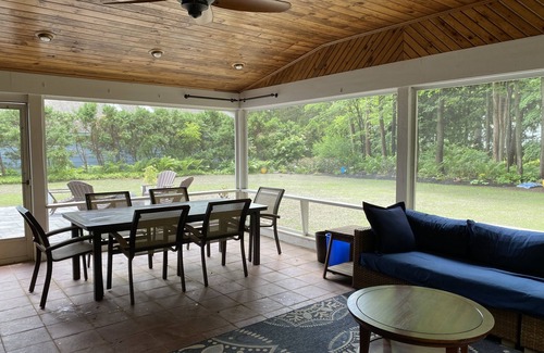 Enjoy the open floor plan that is perfect for entertaining-- Open kitchen, Formal dinning room, Family Room (that can be closed off for noise!) with shuffleboard table, 65" flatscreen tv with plenty of seating. Or enjoy the cozy living room with a view to the large (20x30) screen porch fully equipped with a sectional sofa, table for 6, and drink fridge. Step outside onto the new patio with gas grill and wood burning fire pit.