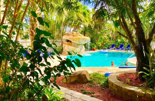 POOL—Dive into our outdoor pool with a waterfall, surrounded by tropical gardens and BBQ tiki huts. Relax and let ocean breezes wash your stress away!