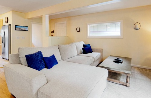 Inside, comfort meets convenience. The open living room features a soft sofa, a large TV, and a wood-burning fireplace. The adjacent full kitchen comes fully prepared for your culinary ventures with its suite of stainless steel appliances and ample meal prep space. Off the kitchen, appreciate having access to a private washer/dryer.
