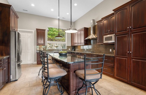 Tropical Trail boasts a fabulous gourmet kitchen with a 9-ft granite center island, perfect for buffet serving. Custom-built cherry cabinets and stainless steel appliances complement this thoughtfully designed grand space. The dining room comfortably accommodates 14 people, with additional seating available around the kitchen island, ensuring the entire group can dine together and relax on plush, comfortable sofas. The living room provides ample seating to enjoy the large flat-screen TV with surround sound or curl up with a good book in front of the crackling fireplace.