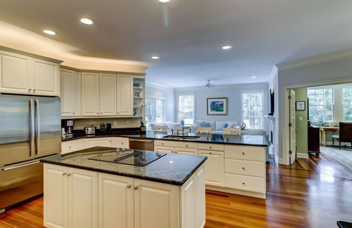 The home highlights a spacious floor plan that is bright and airy. The rooms flow easily from one room to the next. The main living room offers a comfortable space to relax, and enjoy the TV or each other's company. There is a second living room, right off the kitchen and main living room, which make it perfect for multiple families/friends to spread out. The expansive kitchen features stainless steel and beautiful granite countertops. There is plenty of counter space and cabinets which make it easy to prepare a delicious meal. There are ample spaces to sit down together for a meal. There are four kitchen barstools, an eat-in kitchen table that seats 6 guests, and the formal dining area, just off the butler door, which seats 10 guests.