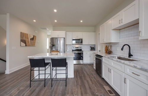 A fully equipped kitchen stocked with all culinary essentials and brand-new stainless-steel appliances includes a kitchen island offering bar seating.