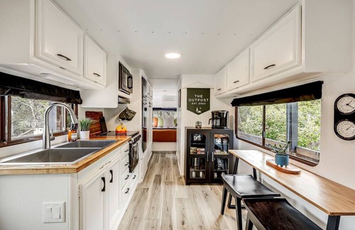 The aesthetic of the Tiny home was inspired by the original 1970's exterior; it was designed to remind you of the joys of being groovy & carefree!