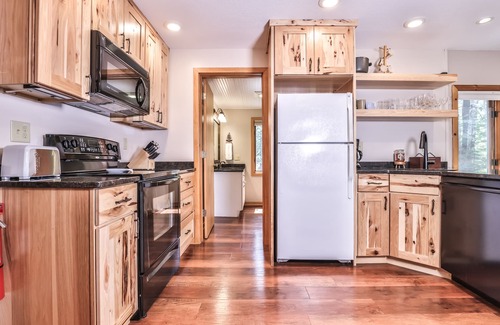 Aerie on Meta Lake is a newly updated two-bedroom home with two full bedrooms and everything you’ll need to enjoy your home away from home. A cozy open-concept living room and kitchen welcome guests into the home, creating a perfect spot to entertain and unwind. Cozy up around the fireplace in the evenings or while you sip your morning coffee. The main level bedroom features a bunk bed with a full and a twin bed. Upstairs you’ll find the owner’s suite with an attached bath and private balcony facing the lake.