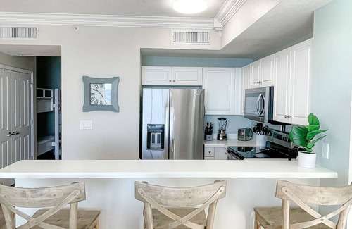 Unit 1707 features one bedroom with a king bed, two full bathrooms, hall bunk beds, and a queen sleeper sofa with a memory foam mattress, this condo can sleep up to 6 guests. We have everything you need to have a comfortable and easy vacation including a fully equipped kitchen with bar seating and dining seating, FREE WIFI, and a full size washer and dryer in unit.