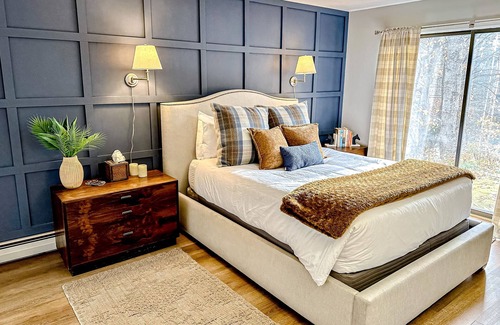 This two-story home away from home enjoys a welcoming living room with an electric fireplace to keep you nice and warm and a TV for endless entertainment during your stay. Cuddle up by the warmth of the fireplace to watch TV, play board games and puzzles, or get lost in your favorite book. The beautiful wooded deck with tree-lined views and a convenient outdoor dining area and grill are attached to the living room. The home's kitchen has been supplied with all the essentials to prepare culinary masterpieces for the group. A fantastic perk of this home is its wonderful location across the street from the Quechee Gorge and River. You can walk across the street with a floatie and hop in the river if you would like to experience a natural "lazy river"!