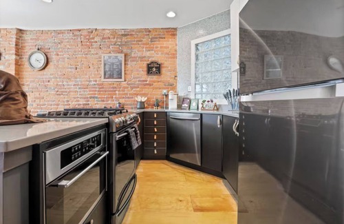 Unwind in the living area on the plush, red leather sectional sofa, set against a stylish exposed brick wall. Large windows fill the space with natural light. The modern kitchen is fully equipped for your culinary adventures, featuring a large island, a gas range, and cabinets stocked with cookware and coffee pods.