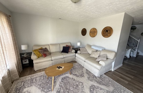 The primary suite with a king bed and private ½ bath are located on the first floor. 2 bedrooms, each with a queen bed, are on the second level which is only accessible by stairs. There is 1 full bathroom on the first floor. We spared no expense when renovating this property. High end fixtures, cabinets, flooring, and furniture complete the quaint, comfortable feel of this unit.