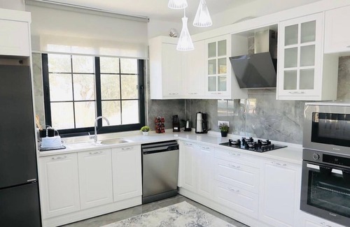 The pool (30m2) and children's pool (8m2) have a mountain view. It has air conditioning, a terrace, outdoor kitchen and barbecue. Private parking, free WiFi, Netflix and Tivibu are also available.