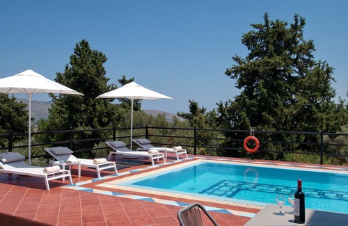 Built on three levels, Villa Artemis provides ideal accommodation for larger families with a generous living area and air conditioning throughout. Each of the first floor bedrooms has its own balcony, providing a little privacy along with the stunning views. Sitting on a terraced hillside in a remarkably peaceful setting, near the tiny village of Maza, Villa Artemis enjoys superb, panoramic views over green and verdant olive groves and rolling wooded countryside to the distant vivid blue sea. LocationVrisses, just 3kms away, has a good choice of mini markets, a renowned baker, and tempting Greek pastry shop as well as a choice of tavernas where you can dine beside the little gushing stream which runs down the leafy valley. In the tiny village of Maza just 1.3km down the hill, Costas Taverna has become quite an institution in Crete and is very well reviewed on Trip Advisor and a long term favourite with guests staying in Villa Artemis. The pretty small resort of Georgioupolis with its wonderful long sandy beach and a huge selection of tavernas is approximately 15 mins drive. Outside Villa ArtemisSwimming pool - 9m x 4m swimming pool with roman step entry, 0.60cm then sloping down to depth of 1.80m.Sunbathing terrace - sunbeds, sofa set, umbrellas and shower.Garden - Lawn area, terraces of olive trees with steps to front entrance and terraced flower beds with sloped access to pool area and rear entrance.Covered Dining Terrace - table and chairs with electric awning.Barbecue House - BBQ, sink with tap, table and chairs.3 first floor balconies - each first floor bedroom has a balcony furnished with chairs and table. Inside Villa ArtemisOpen Plan Ground floor Living area Sitting area – Two comfy sofas and easy chairs, Smart TV with satellite (limited channels/news only), DVD player, double doors opening to the covered dining terrace and garden. Air Con Unit.Dining Area - Wooden table and seating for six, Cretan sofa, entrance door to terraced garden.Kitchen Area - Wooden fitted cupboards, double sink, electric oven with ceramic hob, microwave, dishwasher, espresso maker (Nespresso original capsules) and fridge freezer. Window above the sink to the garden. Single bedroom - Single bed with Cocomat mattress, fitted wardrobes, high windows to side. Air con unit.Shower room - Walk-in shower, hand basin and WC. First Floor Double bedroom - 1 double bed with Cocomat mattress, fitted wardrobe, double doors to balcony with table and chairs and views of the pool and down the valley to the sea. Air con unit.Twin bedroom – 2 single beds with Cocomat mattresses, fitted wardrobes and double doors to a balcony with table and chairs and views of the pool and down the valley to the sea. Air con Unit.Double bedroom - 1 double bed with Cocomat mattress, fitted wardrobe and double doors to balcony with table and chairs and views over the olive terracing, window to the view down the valley to the sea. Air con Unit.Family bathroom - Bath with shower over, hand basin, WC and washing machine.Second FloorDouble bedroom - in the eaves of the Villa, with curtained doorway, low level double bed, easy chair, low level circular windows down the valley to the sea. Air con unit. HousekeepingYour Villa will be prepared for you on arrival with fresh bath and hand towels and all beds made up. For stays of 7 nights or more - house towels will be changed every 3 - 4 days. For stays of 14 nights or more - bed linen will be changed every 7 days. Pool/beach towels - one per person for the duration of your stay.Parking - There is ample parking space next to the Villa off the lane.