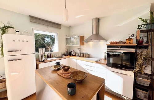 - Open-plan fitted and equipped kitchen with oven, dishwasher, refrigerator, coffee maker, kettle and toaster.