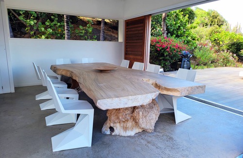 - The main villa with the kitchen and the dining area opened onto the deck, the pool and the ocean view. At the back, a comfortable air conditioned TV room.