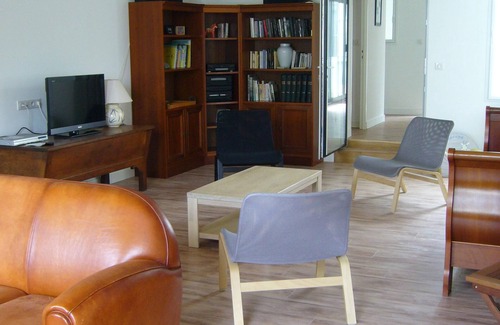 1 large living room of around 40 m2 with library corner and TV