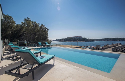 Experience the astounding view and the private seaside swimming pool at this luxury 4-bedroom villa in Pjecana. The villa is ideal for a family or group of 10 people who wish to enjoy an exotic holiday. Since the villa is on the seaside, just 10 m from the sea and 20 m from the beach, you can swap between being at home and by sea as per your wish. There's a supermarket at 80 m if you wish to buy groceries. Some restaurants lie at 20 m, in the immediate vicinity. For an excursion, the town center of the historic Pula is only a 10-minute drive away. The villa has a balcony, which is a great place to sit and enjoy your morning coffee while admiring the stunning views. You can soak up in the sun on the sun terrace with loungers before taking a refreshing dip in the pool. The roofed terrace with dining furniture and a barbecue is great for lavish dinners with some smoky starters. Children would love to play in the private fenced garden.