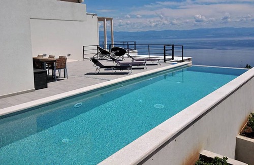 In the picturesque old coastal town of Sv. Jelena, above Mošćenička Draga with a view of the Kvarner Bay, is the beautiful Villa Infinitum.Villa Infinitum is ideal for a break from stress and hustle and bustle.Located in a quiet location, with a beautiful sea view will provide each guest with a piece of paradise.The villa consists of 5 bedrooms, 6 bathrooms and a separate toilet, kitchen with all necessary appliances and living room with sea view. The modernly decorated villa also offers a touch of museum because it is equipped with handmade and recycled metal objects that you can stop by and admire.In the yard of the villa is parking for 5 cars.You can enjoy on one of the several terraces and prepare the delicacies of the Adriatic Sea on the grill.Pets are welcome and a supplement for them is € 100 on a weekly basis. Sv.Jelena is the right destination for your vacation? Infinitum is the name of this object, located in Sv.Jelena. This object is 800 m of air distance away from the sea. During the summer days, look for refreshments for yourself and your family on the beach that is 3500 m away from the object. The beach is: rocky, pebble, larger rock fragments. To stay on the beach, make sure that you bring towels and protect yourself from the sun with a hat or sunshade, and use a protective cream. Infinitum has a secured parking, which is another advantage of this accommodation, and is of crucial importance if you travel by car on your vacation. During your vacation, most people love to prepare fish or meat on the grill for dinner or lunch. And after dinner enjoy the night in a pleasant company. The object "Infinitum" has Grill, so if you like barbecues then you will definitely enjoy staying in this object. If you are traveling with a pet then you will be positively surprised because this facility has the option of accepting pets. Pet friendly accommodation - only by prior arrangement with the agency (extra fee paid to host). Any additional questions related to the beach or destination Sv.Jelena please check with your host because they still know best the location. We wish you a warm welcome to our facility Infinitum in destination Sv.Jelena.