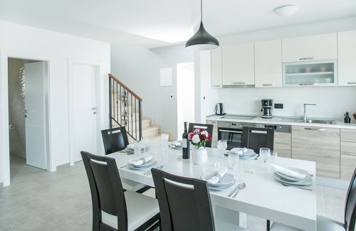 This modern villa is perfectly located in Seget Donji, 20 minutes walking time from the heart of the UNESCO'S city Trogir, 6 kilometrs from the airport and just a few minutes walking time to the beach. The villa is suitable for maximum 8 people and is perfect for families or group of friends looking for a complete tranquility and privacy. All 4 bedrooms have Internet connection (Wi-Fi), air conditioning .On the ground floor of the villa, you will find a spacious living room, kitchen and dining room with a table and chairs, one large bedroom and a bathroom.The villa has an outside dining area with BBQ, swimming pool and sun chairs,villa is south facing with sea view. This perfect location gives you an opportunity to visit Split, Krka waterfalls and nearby islands.