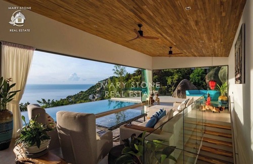 Luxurious 5-Bedroom Villa with Expansive Seaview. Offering breathtaking sea-view vistas. Enjoy a peaceful and private retreat with meticulous daily maid service ensuring a pristine environment. Sleep in comfort with high-quality bedsheets, towels, and duvets. Stay cool with air conditioning in every room. Take a refreshing leap into the pool directly from the living room or sunset terrace, and bask in the serene, picturesque surroundings.