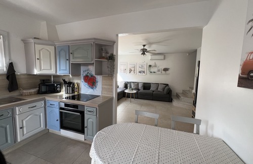 Everything within walking distance. Our house not only offers proximity to beautiful beaches, it has a large air-conditioned living room, a fully equipped kitchen, 2 charming air-conditioned bedrooms with a double bed, one with an extra bed. 1 small room also air-conditioned with two single beds (90×200cm), a pleasant one Outdoor area with nice seating and lounging options. You can park on the completely fenced property. Wonderful starting point for many activities such as water sports, amusement park, go-karting, golf, wine tasting, water park and of course all the wonderful villages in the mountains and by the sea. Cannes is just over half an hour away and the boat to St.Tropez leaves from the harbor.