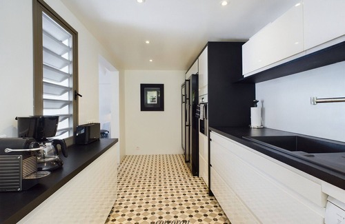 Open to living room, fridge, freezer, dishwasher, oven, microwave oven, filter coffee maker, espresso coffee maker, toaster, kettle, juicer, blender, large wine cellar.