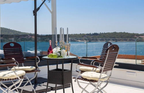 This luxurious villa is located directly on the sea, with a wonderful view of the sea and Marina Frappa, one of the most beautiful harbors in Croatia and a view of Rogoznica. The picturesque town of Primosten is in the immediate vicinity. All bedrooms have a direct view of the sea. Each bedroom has its own bathroom. In the spacious living room there is a 65 inch TV, all 5 TVs in the house have Netflix and WLAN, the infinity pool has waterfalls and massage.