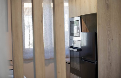 VillaOleais a two-storey building fit for 4 people. On the bottom floor there’s afully equippedkitchen, with every utility you might need, the dining area, a toilet and finally, the living room installed with a fireplace, where you can kick back and marvel at the view before you through the large glass window.