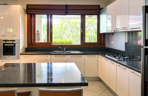 Villa Sansuk is a spacious single-story home set within a lush garden, offering a private pool and a variety of local trees. The villa features 3 bedrooms and 2.5 bathrooms, including one Jack & Jill bathroom, an office, and a laundry room. The open kitchen with a cooking island flows into the dining and living areas, providing a comfortable space for relaxing. The villa is equipped with air-conditioning and ceiling fans for your comfort.